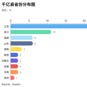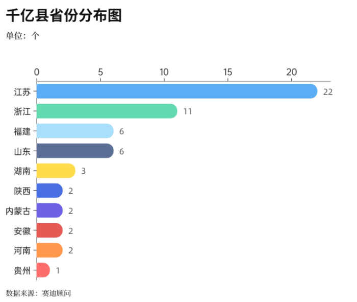 “千亿县”可谓是2844个全国县级行政区中特别的存在。数据显示,过去三年时间里,千亿县分别增长10个、5个、3个,千亿县阵容持续扩容。截至目前,62个千亿县主要分布在江苏、浙江、福建、山东等15个省份,其中江苏、浙江、福建、山东分别达22个、11个、6个、6个,堪称千亿县“收割机”。