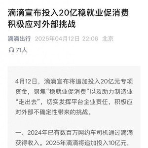 一、2024年已有数百万网约车司机通过滴滴获得收入。2025年滴滴将追加投入10亿元,通过增加补贴、优化收入和权益保障等举措,帮助出口重点区域的新增司机群体实现顺利过渡,继续发挥平台就业“蓄水池”和“稳定器”功能。