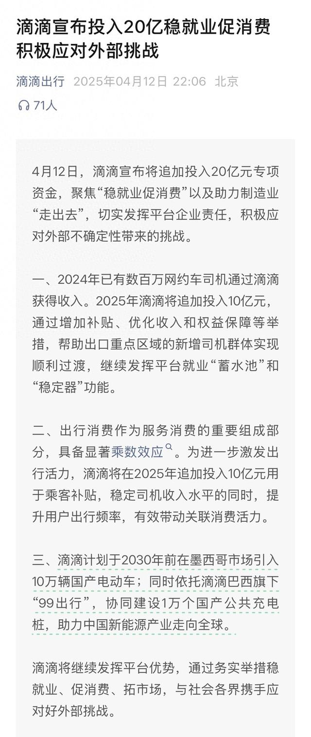 4月12日,滴滴宣布将追加投入20亿元专项资金,聚焦“稳就业促消费”以及助力制造业“走出去”,切实发挥平台企业责任,积极应对外部不确定性带来的挑战。