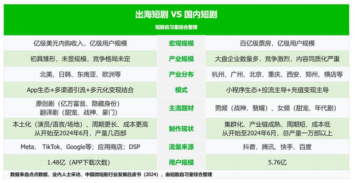 《2024年中国短剧出海行业报告》显示,对比出海短剧和国内短剧的区别,就会发现两者相同点在于内容都有快节奏、强情绪的特点,推广手段都以媒体平台买量为主,但两者在商业模式、流量来源等方面存在较大的差别。比如出海短剧采取的是App+多渠道引流+多元化变现模式,而国内本土短剧则是采取小程序生态+投流主导+充值变现模式;平台方面则是出海短剧主要在Meta、DSP等,本土短剧主要在抖音、腾讯和快手等;制作方面出海短剧周期更长、成本更高,本土短剧更集群化、周期短且成本低。对比两者的发展历程,国内短剧始于2020年,出海短剧始于2022年,2024年两者齐驱并进,相互促进。