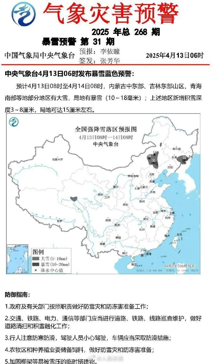 4月12日,辽宁阜新漫天飞雪。4月13日,吉林长春一夜桃花雪,半树繁花半树白。4月13日,中央气象台继续发布暴雨蓝色预警。