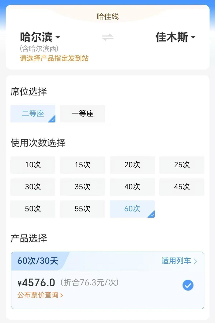 以哈尔滨站至佳木斯站二等座为例
