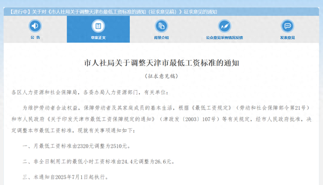 4月11日,天津市人社局发布关于对《市人社局关于调整天津市最低工资标准的通知(征求意见稿)》征求意见的通知,其中明确——