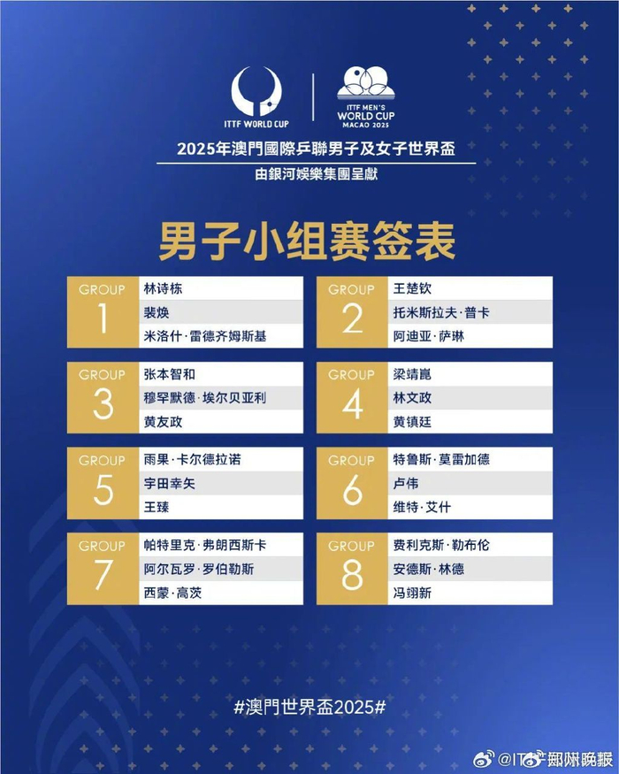 今天,2025年澳门国际乒联男子及女子世界杯抽签结束。