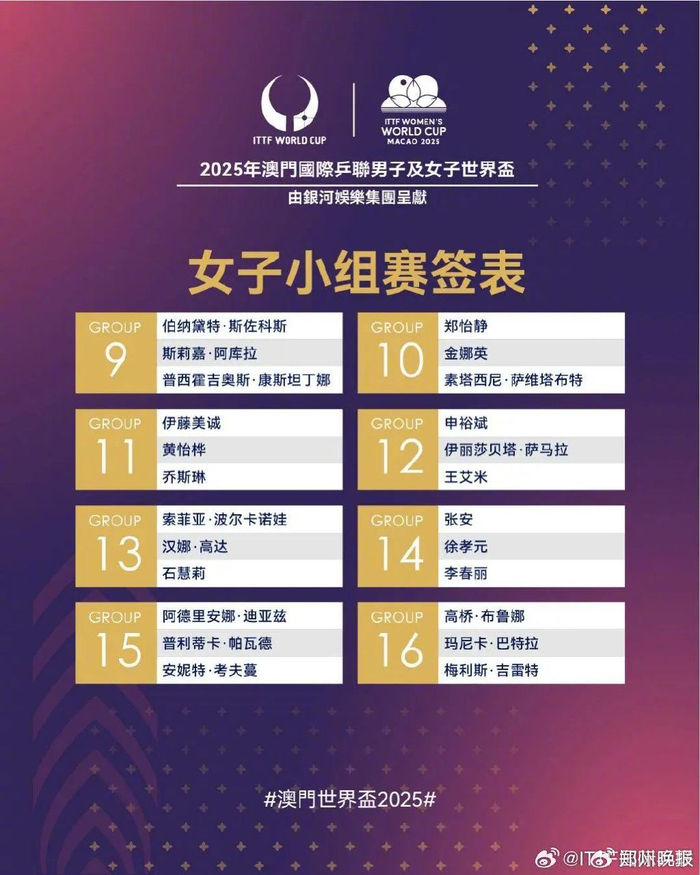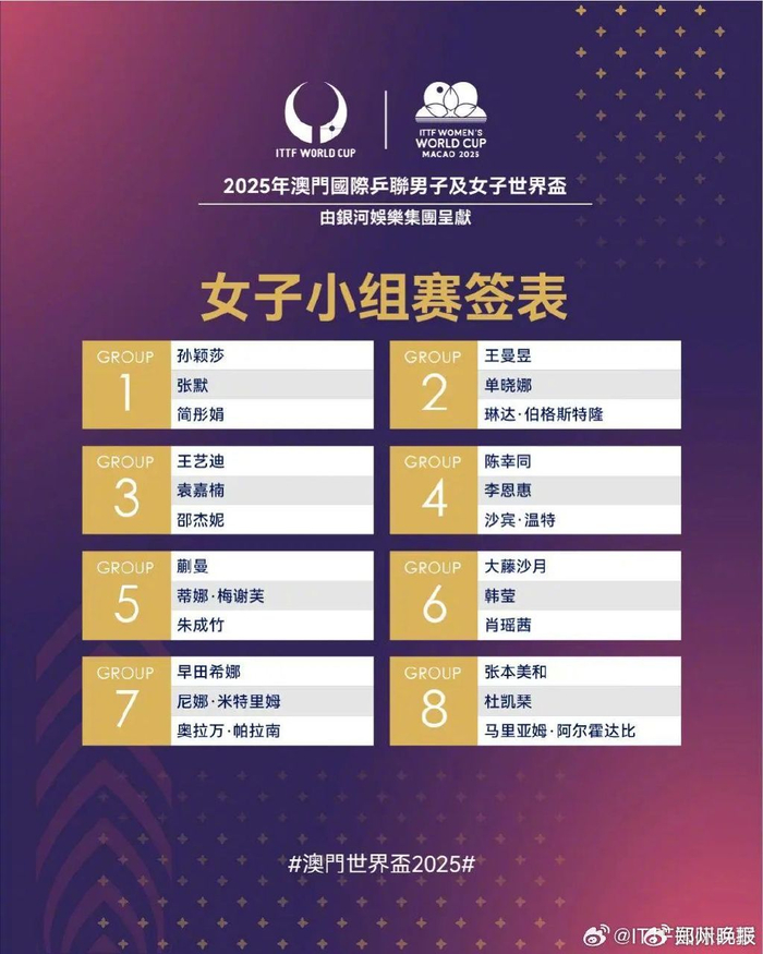澳门世界杯抽签结束 孙颖莎王楚钦小组赛对手出炉