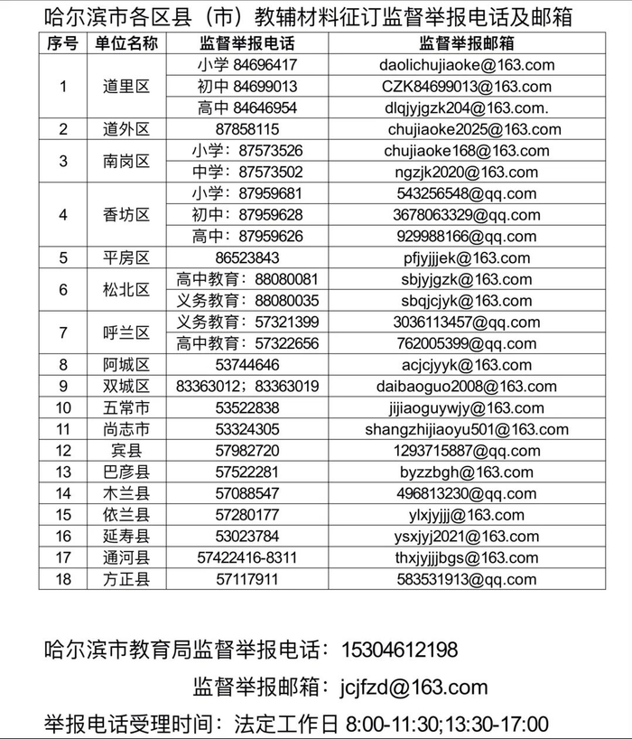 为进一步规范教辅材料征订与校服采购工作,保障学生及家长的合法权益,营造风清气正的教育环境,4月11日,哈尔滨市教育局公布了针对教辅材料征订、校服采购的监督举报电话及邮箱。市教育局及各区县(市)教育局均已设立专门渠道接受社会监督,法定工作日8:00-11:30、13:30-17:00期间,市民可拨打电话或发送邮件反映相关问题。