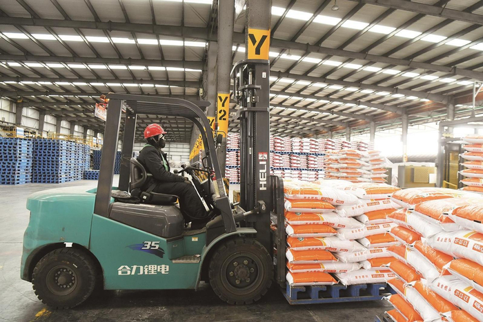 这边互联网平台以大数据为纽带让企业焕发新生,那边在企业货运车间,货运机器人助力物流运输实现高效化。只见一排排成品化肥正等待着完成自己的使命,这些化肥通过拆垛、拆包、输送、装车,最终将会运往全国各地。