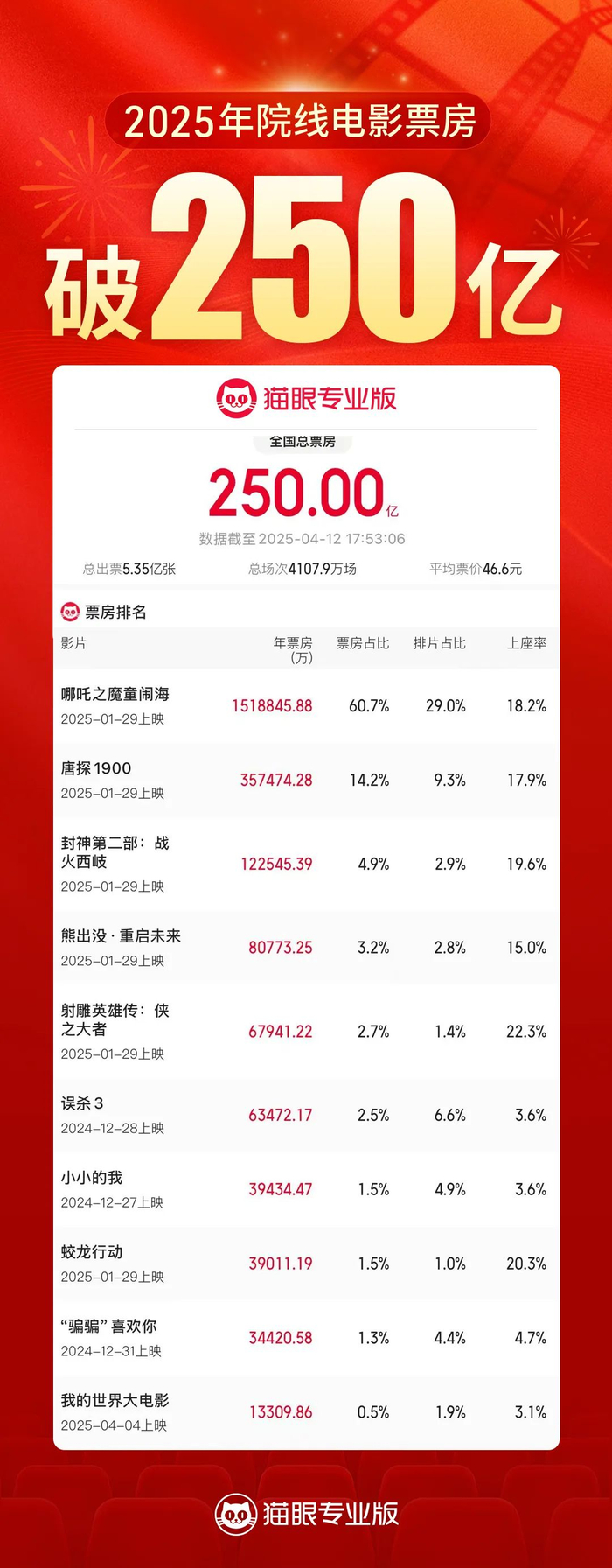 据网络平台数据,截至4月12日17时38分,2025年度大盘票房(含预售)已突破250亿元,居全球第一。其中,《哪吒之魔童闹海》以60.8%的票房占比断层领跑。