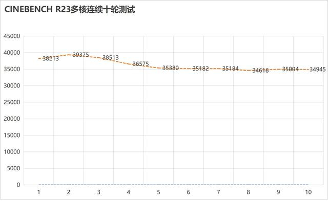 R23多核心连续十轮测试最高分为39375,最低分为34616,从第三轮开始之后性能开始保持相对比较稳定的状态。