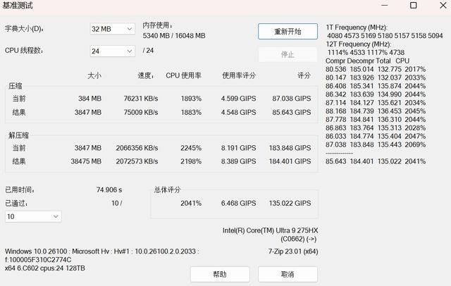 7-Zip压缩与解压缩测试,压缩速度75009KB/s,解压缩速度2072573KB/s,速度还是相当快的,毕竟是24核24线程设计。