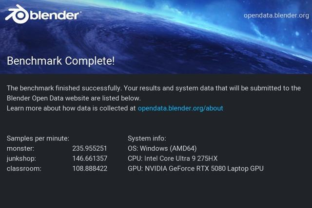 Blender benchmark monster、junkshop、classroom三项测试渲染采样率分别为235.96、146.66以及108.89 Samples/min,速度同样是快了不少,但Blender渲染采样还是GPU更快,所以CPU分数只做一个参考即可,实际使用还是要靠GPU来保障效率。