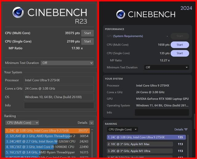 CINEBENCH R23单核得分2199,多核得分39375;CINEBENCH 2024单核得分135,多核得分1658,对比酷睿i9-14900HX的R23单核2134、多核33124以及2024单核128、多核1831的跑分表现,酷睿Ultra 9 275HX多核性能提升还是比较明显的。