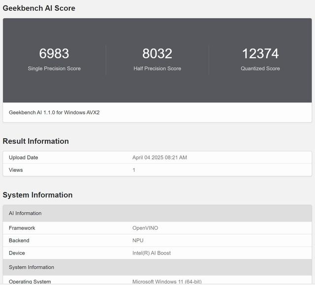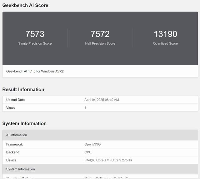 Geekbench AI主要测试计算单元的单精度、半精度以及量化性能。酷睿Ultra 9 275HX的CPU在三项测试中分别得到7573、7572以及13190分的成绩;NPU则分别为6983、8032以及12374分,CPU部分的单精度和半精度算力比酷睿Ultra 9 285V要高不少,量化性能略高一些,NPU部分的单精度算力略高一些,但半精度和量化性能不及酷睿Ultra 9 285V。