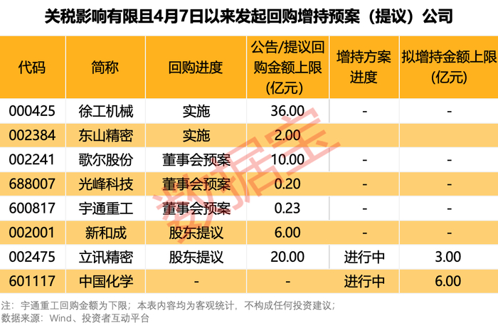 整体来看,自4月7日至4月11日,共有8家公司火速开启回购、增持行动,以稳定市场信心,其中立讯精密打出回购增持“组合拳”,按回购提议金额上限(12个月内完成)及拟增持金额上限(6个月内完成)计算,公司有望在未来12个月内回购增持合计最高达到23亿元。