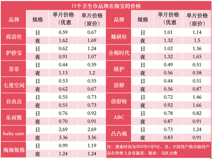 头部电商平台上15个卫生巾品牌的价格。(图表/马社力佛)