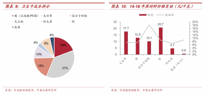 中泰证券2019年的研报指出,卫生巾行业为高毛利率行业,平均毛利率可达45%;经销商层层加价,终端售价可高于出厂价3倍多。卫生巾工艺较简单,主要分为面层、吸收体、底层和胶,其中吸收体成本占原材料比例最大,约为50%。