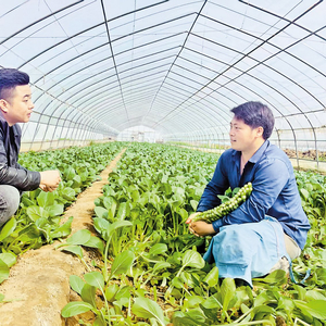 4月10日,首衡高碑店国际农产品交易中心水叶菜产地对接负责人刘浩(左)到大棚查看菜心种植情况。本报记者 潘文静摄