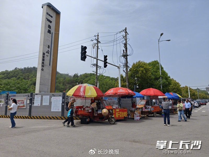 油松路与映日路交叉处,卖吃的、饮料和登山用具的摊贩有七八家,吆喝声此起彼伏。