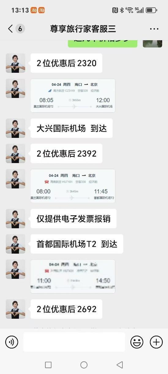石女士:当时就是说你们买票方便,我们是内部的,我们能打折扣,这是我记得真正的这两句话。我也查了查飞机票是1100一个人,他给我发过的价位是2320。