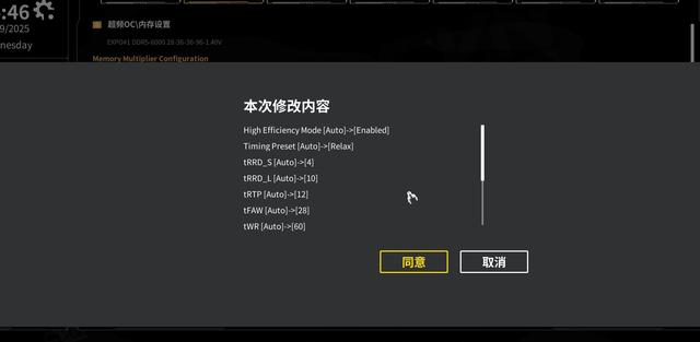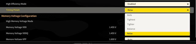 同时我们也使用了这款主板的High Efficiency Mode功能,优化了小参,这次选择了Relax模式。先来看一下小参优化前后的变化。