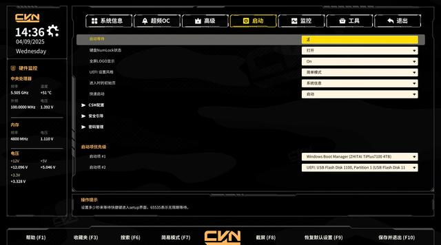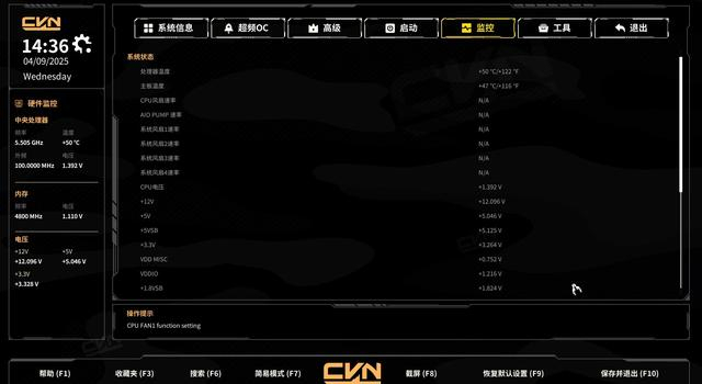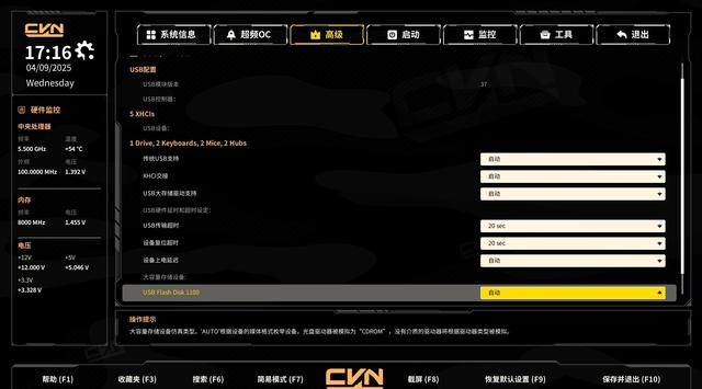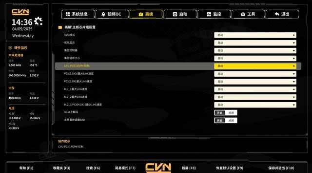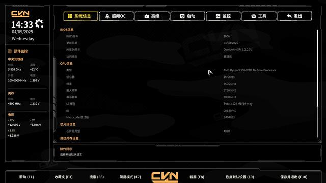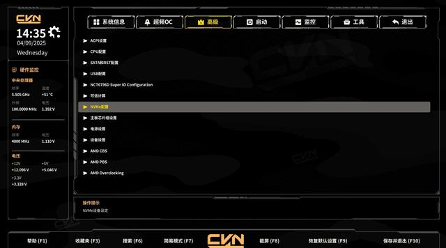 七彩虹 CVN X870 ARK FROZEN V14 主板目前也采用了最新CVN系列风格的UEFI界面,主菜单依旧汇聚了语言。收藏夹。BIOD更新、RGB、EXPO/XMP这些功能快速设置,方便快速调节。