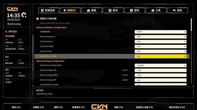 七彩虹 CVN X870 ARK FROZEN V14 主板这次最大的提升在 BIOS 上,更新了High Efficiency Mode,一键优化DDR5内存小参,解放玩家生产力,将时间节省到调小参之外。而且这款方舟主板自动优化小参能力也很强,不管是EXPO还是XMP都能轻松兼容适应,带来10%以上的性能提升。