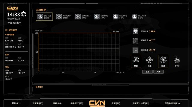 风扇控制界面提供静音、标准、全速、手动四种调节模式。