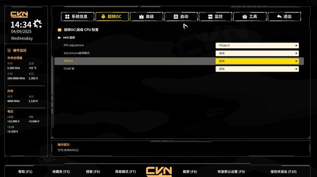 CPU超频界面用来调节AVX 512、FCH扩展这类的设置,关闭AVX 512对于游戏玩家降低功耗发热比较有帮助,一般可以关掉。