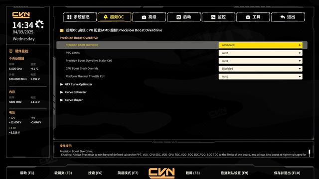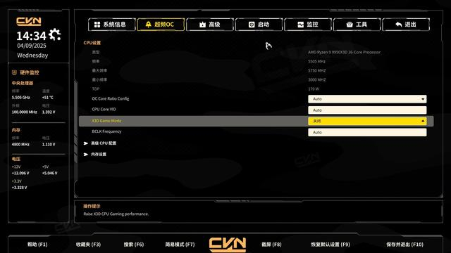 旁边来到针对超频的OC界面,首先是针对CPU设置的主界面,能简单调节频率,开启X3D模式这些设置,本身这代锐龙9000没什么超频空间,而且有PBO了,所以能看到七彩虹将更多精力放在了最下面的内存超频上。