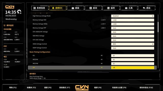 再往下来到了这款主板最重要的内存超频界面,目前七彩虹BIOS在内存超频上做的十分出色,确实DDR5超频收益现在比CPU大多了,所以七彩虹在这方面下了功夫。在界面中七彩虹整合了频率、电压、小参等设置,可以一个页面调节所有内存超频相关的设置。