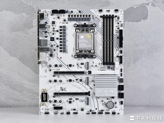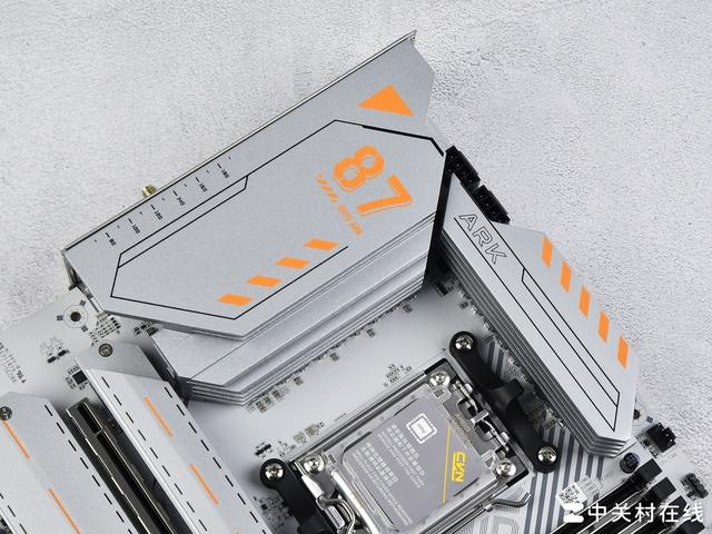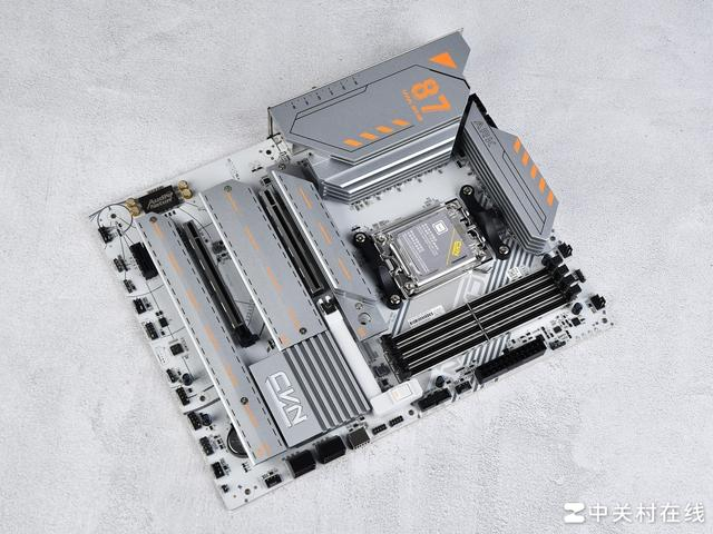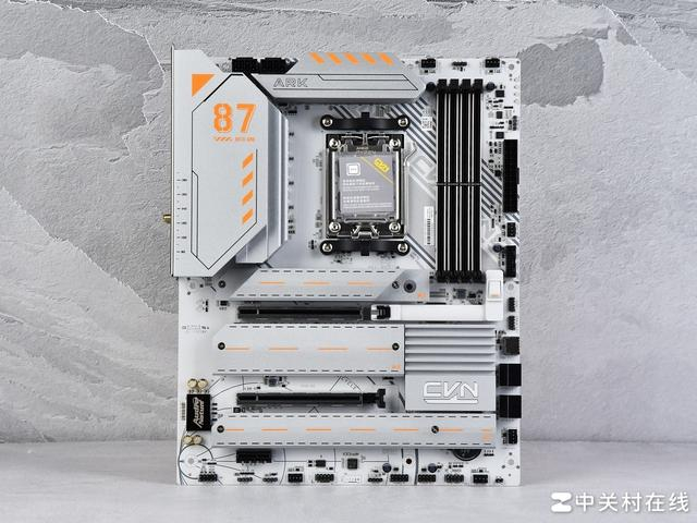 七彩虹 CVN X870 ARK FROZEN V14 主板采用了标准ATX版型。这次七彩虹的涂装更加精致,PCB使用了雾化工艺,看起来质感十足,绝不是那种简单的白颜料喷绘。正面印有黄色的87字样LOGO标明这是一款X870芯片组主板,并且在VRM、M.2和芯片组都覆盖了寒霜散热装甲。