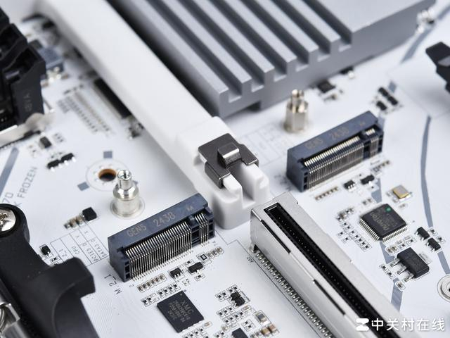 七彩虹 CVN X870 ARK FROZEN V14 主板PCIe插槽周围是三个M.2插槽,全部配备寒霜冷凝金属散热片,并支持22110全长尺寸规格。其中M.2_1槽和M.2_2槽均支持PCIe 5.0协议,剩下M.2_3槽则支持PCIe 4.0协议,而且要注意M.2_3槽与上面的PCIe 4.0 x4长插槽共享带宽,其中一个插入设备时,另一个就会不启用。