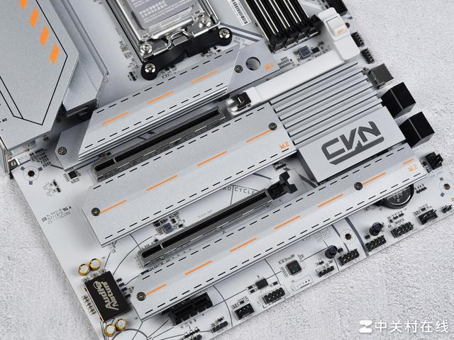 PCIe插槽方面,七彩虹 CVN X870 ARK FROZEN V14 主板配备3根PCIe 插槽,包含1个PCIe 5.0 x16长插槽,1个PCIe 4.0 x4长插槽,以及1个PCIe 3.0 x1短插槽。其中PCIe 5.0 x16和PCIe 4.0 x4这两根长插槽均采用了金属加固。
