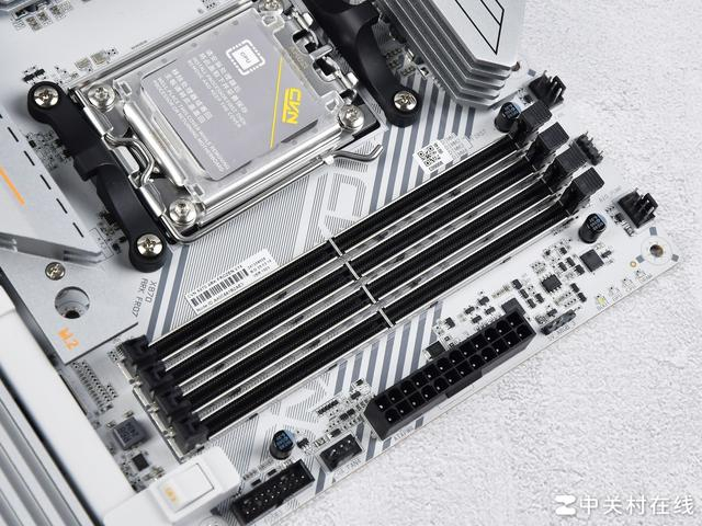 七彩虹 CVN X870 ARK FROZEN V14 主板提供4根DDR5内存插槽,并全部采用金属加固,最大容量支持192GB,频率可以达到8200MT/s,支持XMP和EXPO两种内存标准、一般XMP内存频率会更高,好一点的型号在7000-8400MT/s左右,EXPO主要在6000-6400MT/s,特点是时序低。这代锐龙9000依旧会在6400MT/s以上时分频,所以两种内存实际没有太多性能差异。