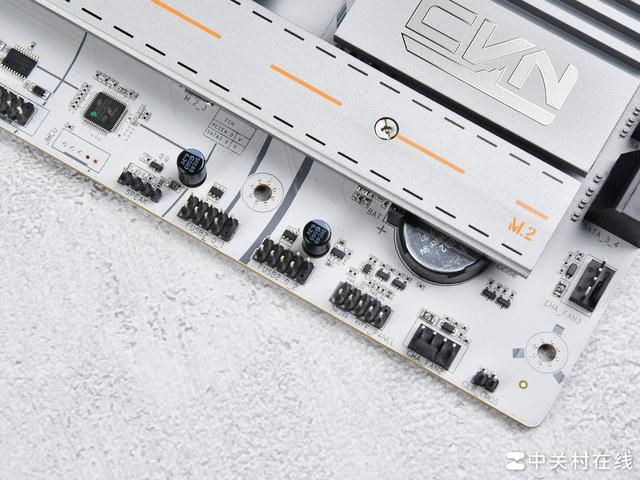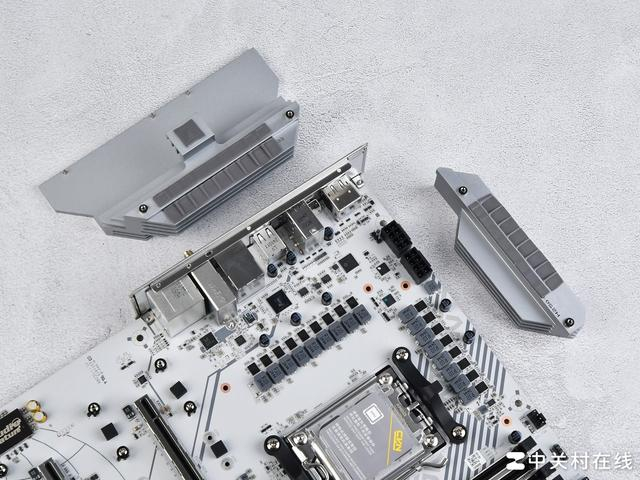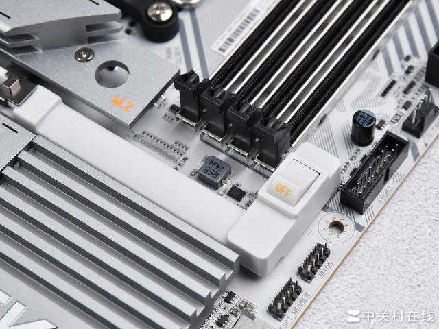 这款主板VRM散热装甲采用经典的双金属散热片组合,这两块寒霜冷凝装甲底部配备导热垫,正面则增加流线型设计,提升主板在机箱内风道带来导流效率,帮助MOS快速散热。