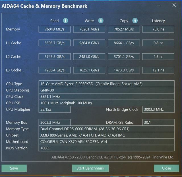 这套EXPO 6000MT/s内存在七彩虹 CVN X870 ARK FROZEN V14 主板上,读取达到76049MB/s,写入达到78281MB/s,延迟为75.8ns。能看出来对比锐龙7000时期,锐龙9000整体对于DDR5内存支持更好了。