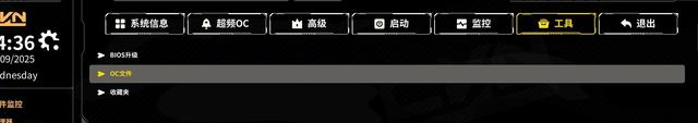 工具菜单包含BIOS升级、OC文件以及收藏夹。OC文件能偶保存读取超频记录,用于还原超频设置,反复尝试超频使用。