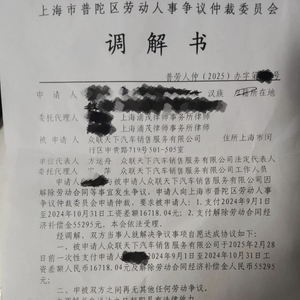 一份由员工提供的上海市普陀区劳动人事争议仲裁委员会调解书显示,被申请人众联天下汽车销售服务有限公司应于2025年2月28日前一次性支付申请人2024年9月1日至2024年10月31日工资差额16718.04元,以及解除劳动合同经济补偿金人民币55295元。