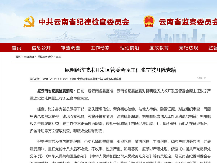 昆明经济技术开发区管委会原主任张宁被开除党籍