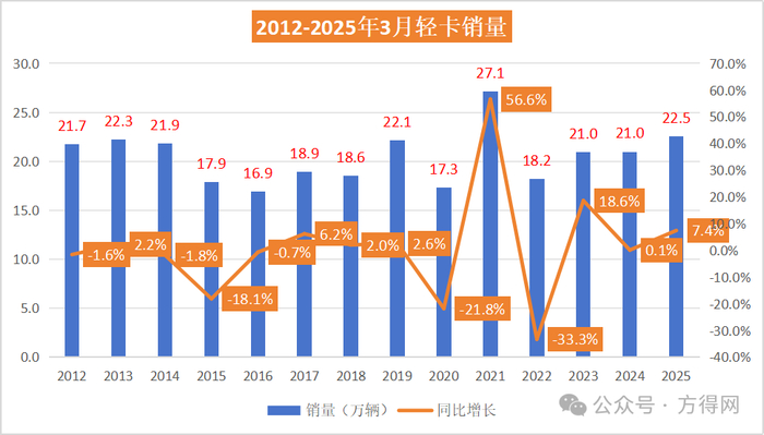 2025年3月,轻卡市场迎来首次增长,销量22.5万辆,环比大增47%,同比7.4%。
