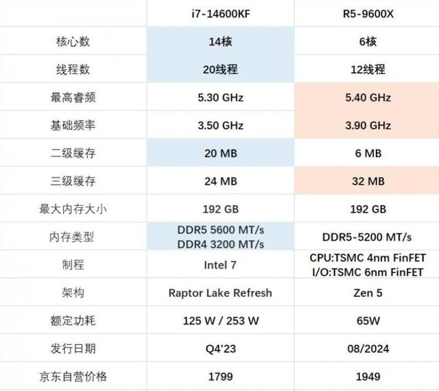 英特尔i5-14600KF和AMD 9600X在核心参数上展现了不同的设计理念: