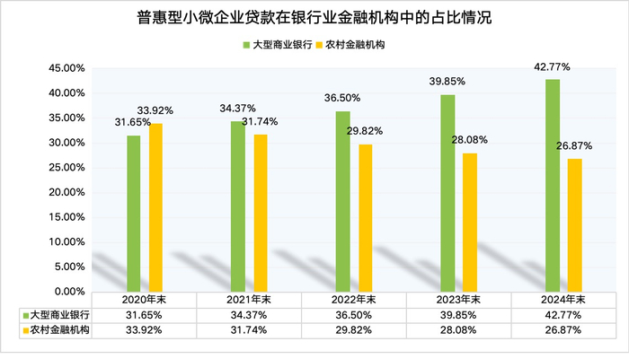 在金融科技等优势加持下,大型商业银行的普惠金融业务占比正在持续提高,而农村金融机构的市场份额则在下降。