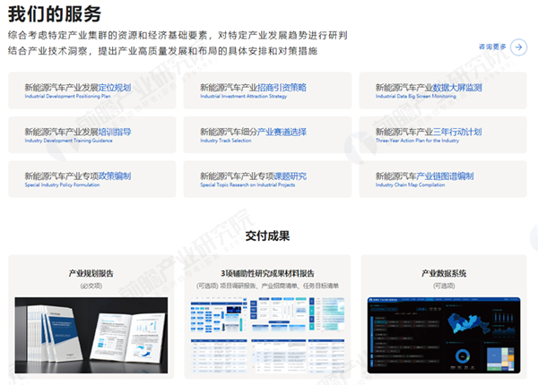 前瞻产业研究院作为更懂中国产业的科技型决策智库,先行成立了“新能源汽车产业规划所”,希冀发挥“产业研究+大数据+技术洞察+招商资源前置”的独家特色产业规划服务,为各地政府提供既科学、又前瞻、更落地的产业规划整体咨询方案。不仅提供产业规划、招商引资、园区建设、和项目运营等综合服务,还提供海洋经济产业数据大屏监测、产业链图谱编制、专项政策编制及培训指导。