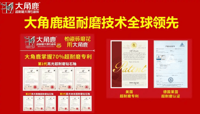 作为超耐磨瓷砖的发明者,大角鹿一直走在行业技术最前沿,其技术优势得到了业内外的广泛认可。自首创第1代亮光超耐磨钻石釉国家发明专利技术,并率先推出大角鹿超耐磨大理石瓷砖以来,大角鹿聚焦超耐磨领域不断推动技术迭代升级,以第2代亮光微雕超耐磨钻石釉、第3代纳米柔光超耐磨钻石釉,不断突破瓷砖耐磨度“天花板”,并将超耐磨技术应用从亮光砖成功拓展至柔光砖品类。其中,第3代纳米柔光超耐磨钻石釉瓷砖的耐磨度达4级以上,较普通瓷砖高出3倍,同时兼具耐磨、防滑、防污、易洁四大功能。为了攻克抗污难题,大角鹿进一步升级了超抗污技术,推出了“超抗污柔光砖”,以“0渗透、超抗污、易清洁、超耐磨”四大性能为亮点,轻松抵御划痕,清洁成本大幅降低。