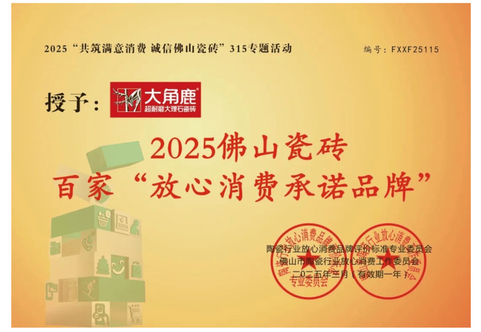 品牌是否真正属于一线,最重要的标准往往是消费者的口碑。大角鹿凭借卓越的产品质量和优质的售后服务,积累了大量忠实的消费者,赢得了市场的广泛赞誉。尤其在刚过去的315期间,凭借全球领先的超耐磨技术,大角鹿成功入选“2025佛山瓷砖百家放心消费承诺品牌”,再次证明了其在行业中的领先地位。此外,品牌还荣获金致奖“消费者信赖质量标杆品牌”,体现了消费者对其质量和服务的高度认可。