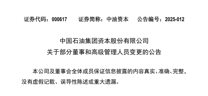 需要注意的是,蔡勇于2024年12月底任中国石油集团资本股份有限公司董事长,又于近日卸任,他此次担任董事长仅三个多月。此前,蔡勇于2025年3月底,跨企业升任中国石油化工集团有限公司总会计师、党组成员(相关链接:中石油、中石化重大人事调整!)。