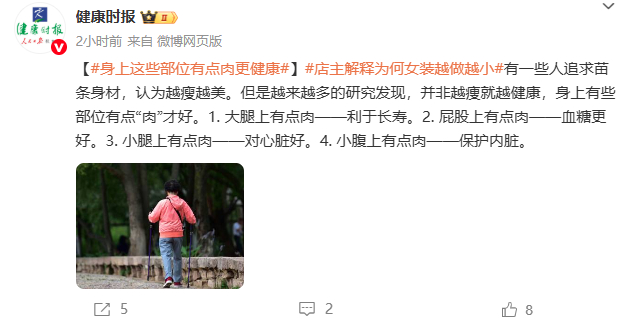 她进一步分析说,一方面,商家尺码越做越小,博主穿小码服装引流,都是因为有爆点,有人愿意为此买单;另一方面,这些商家和博主通过宣传再次加剧普通人的自我怀疑和焦虑——仿佛全网都是模特身材的人,自己穿不进小码衣服就是不健康、不美,甚至会以不健康的方式盲目减肥、追求所谓“完美身材”。