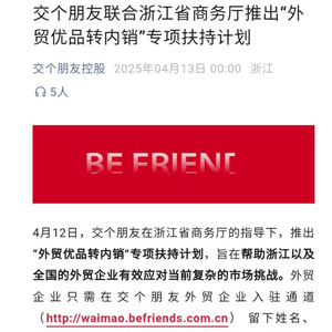 而在4月13日交个朋友控股的官方微信上发布了其联合浙江省商务厅同样也推出其“外贸优品转内销”专项扶持计划——为外贸企业提供产品品牌展示和直播销售服务,助力外贸企业快速开拓国内市场、建立国内品牌。