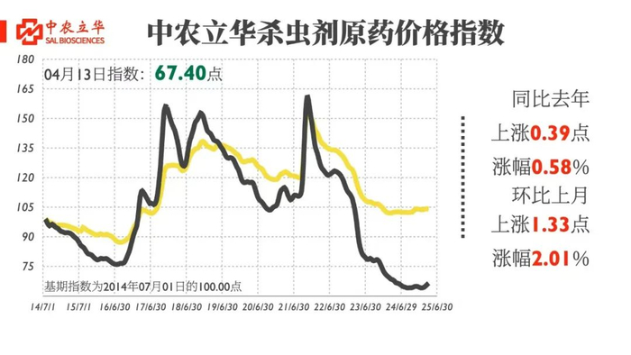 2025年4月13日,中农立华杀虫剂原药价格指数报67.40点,同比去年上涨0.58%,环比上月上涨2.01%。