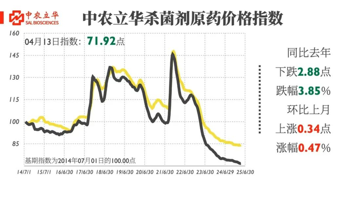 2025年4月13日,中农立华杀菌剂原药价格指数报71.92点,同比去年下跌3.85%,环比上月上涨0.47%。